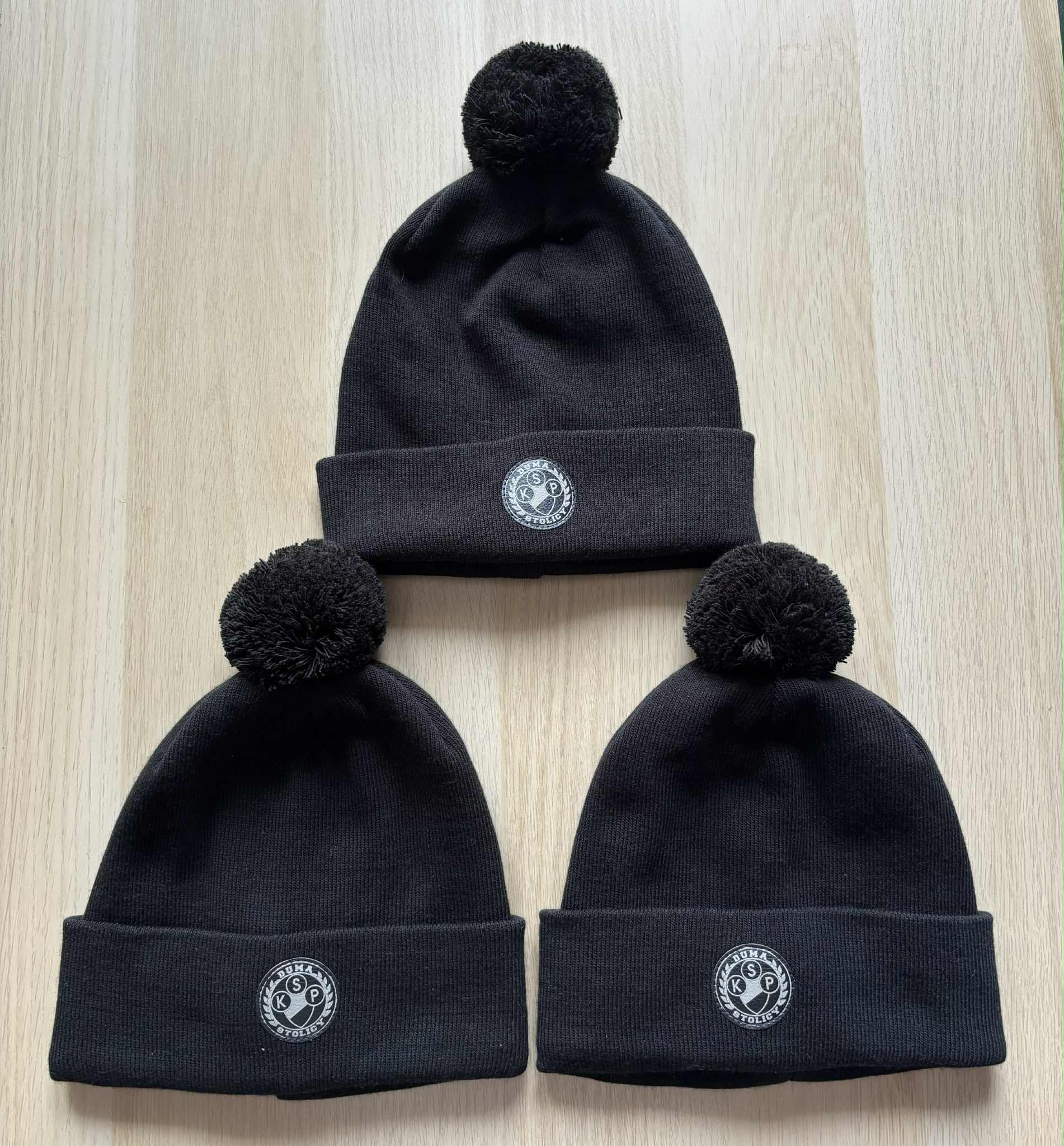 Czapka zimowa z pomponem i szarym herbem(skórka). Materiał-akryl. One size.